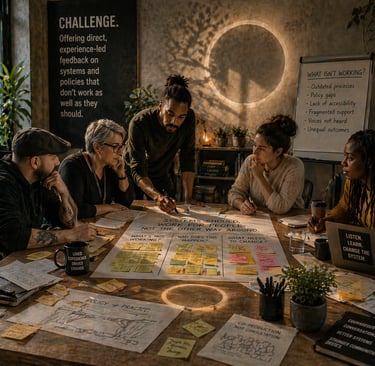 Offering direct, experience-led feedback on systems and policies that don't work as well as they should.